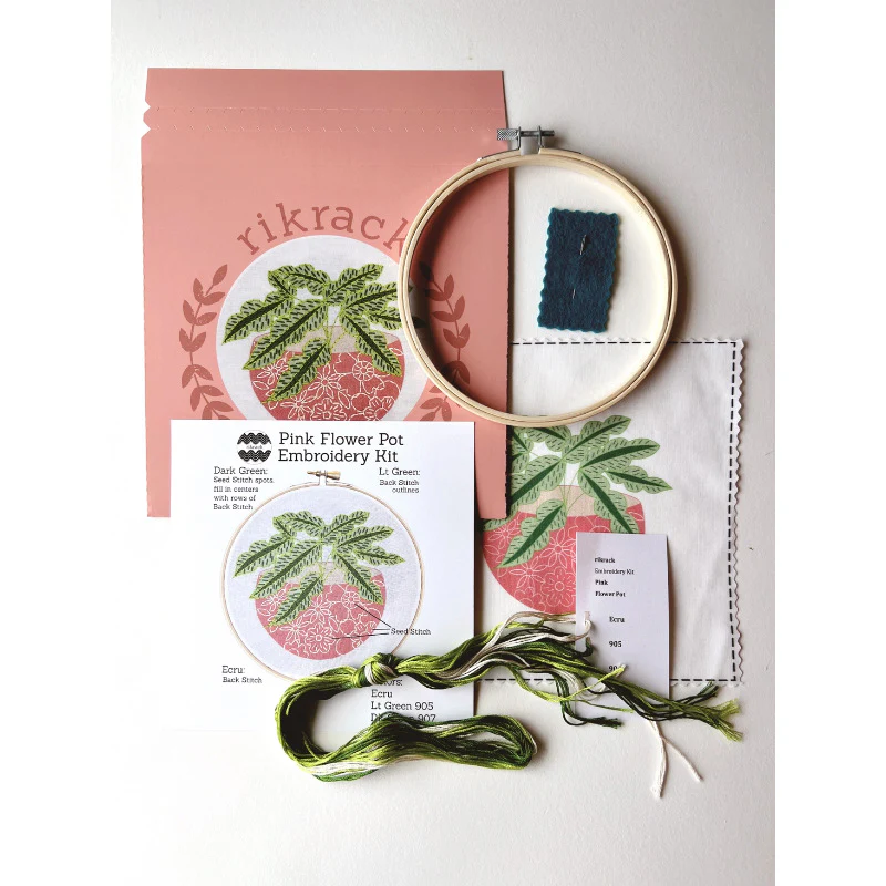 The Pink Flower Pot Embroidery Kit from Rikrack Embroidery comes with everything you need to complete this 6” hoop. Suitable for beginners and beyond. Rikrack kits are designed to look intricate but to actually be super easy and fun to stitch.
